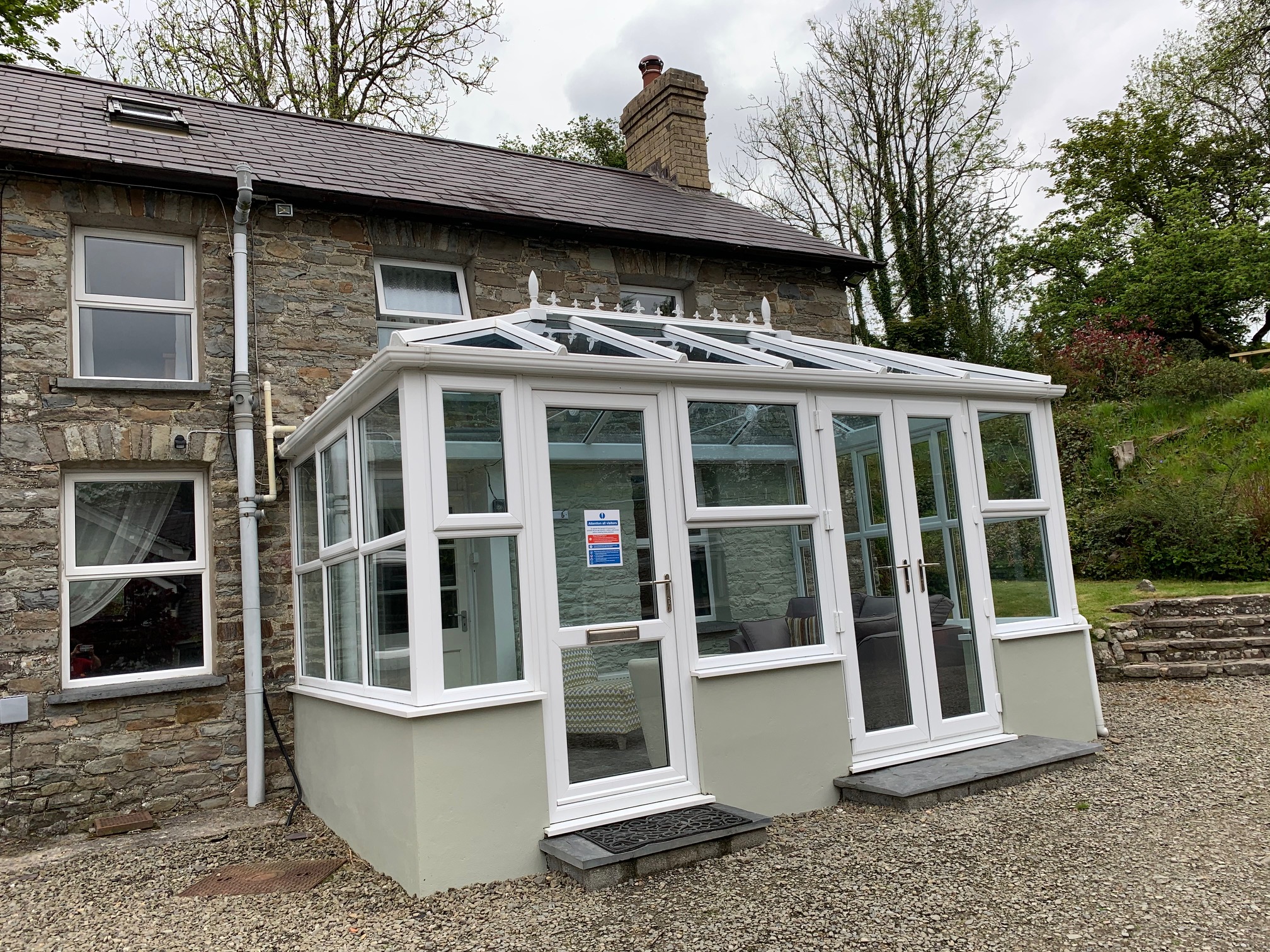 Conservatory - with door access from outside and double french doors. Comfortable sofa and two easy chairs. Coat hooks.